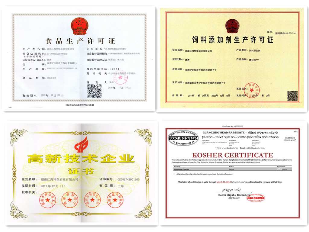 湖南江海環保實業有限公司圍繞環保、節能、資源綜合利用的科學理念,確立了依靠科技走精品路線,一直把高(高品質)、純(純度高)、特(特種用途)作為我產品的發展方向,我廠高純工業氯化銨主要包括分析級氯化銨、醫藥級氯化銨、食品添加劑氯化銨、飼料添加劑氯化銨、電子級氯化銨、電池級氯化銨、精制型低鉀鈉氯化銨,并獲得了食品衛生許可證、美國kosher認證等一系列質量認證,通過了SGS第三方、及省市檢驗機構的多重檢測。